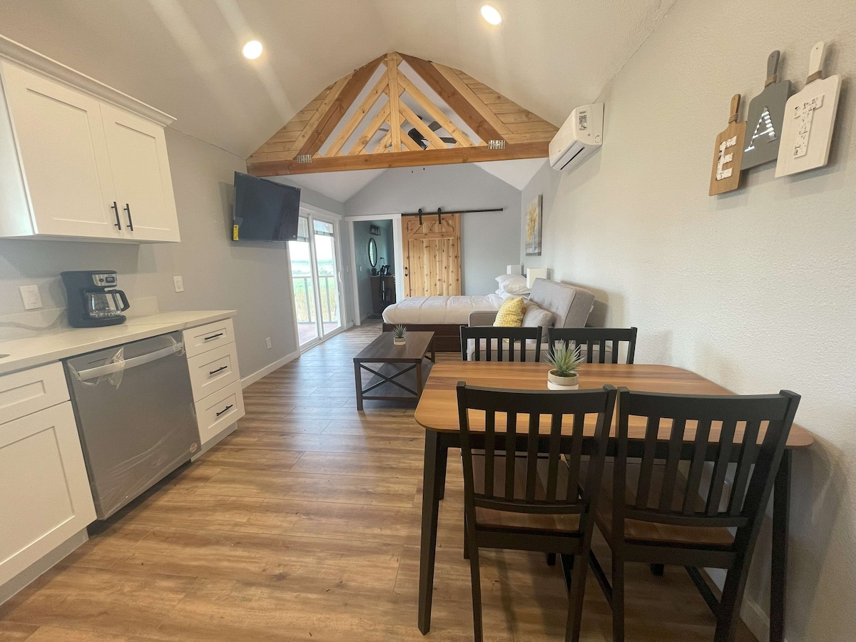 Modern remodeled barn house in the heart of wine country with large private deck. Brand new full-size kitchen and full-size washer & dryer. Wine country tranquility for a romantic getaway or for anyone looking for some peace and quiet. Shares a 4.6-acre lot with just two other houses. One queen bed and one full size sofa bed.